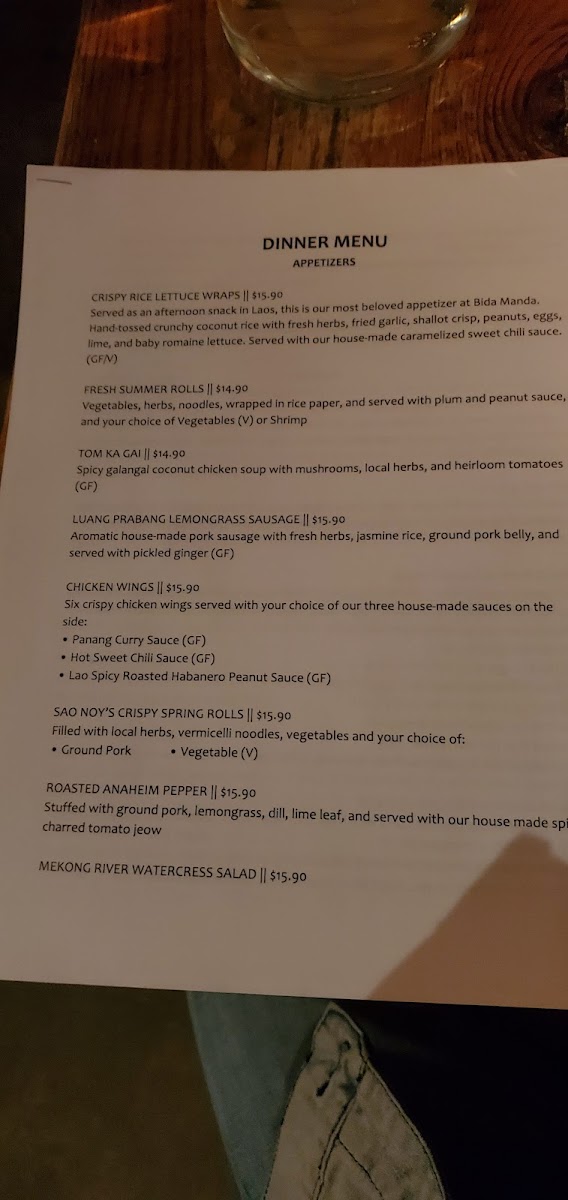 Served as an afternoon snack in Laos, this is our most beloved appetizer at Bida Manda. Hand-tossed crunchy coconut rice with fresh herbs, fried garlic, shallot crisp, peanuts, eggs, lime, and baby romaine lettuce. Served with our house-made caramelized sweet chili sauce. (GF/V)